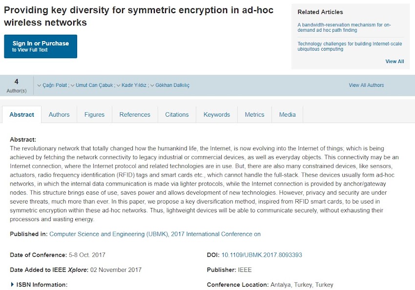 Yazımına katkıda bulunduğum "Providing Key Diversity for Symmetric Encryption in Ad-Hoc Wireless Networks" makalesi ieeexplore tarafından yayımla…